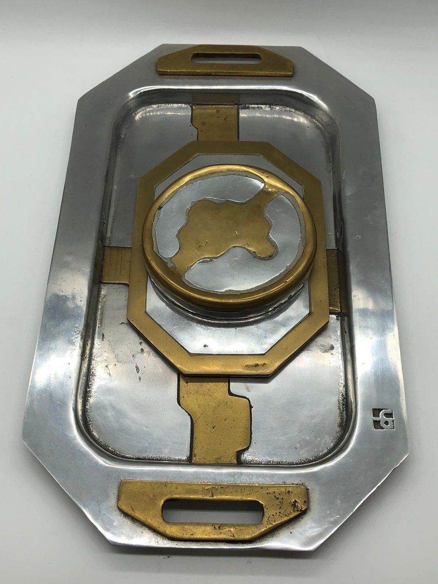 The trays are made of solid brass, whose warm, golden color creates a fascinating contrast to the cool, shiny aluminum. The surfaces emphasize the industrial charm of brutalism. Every detail, from the hard edges to the visible welds, has been carefully crafted to emphasize the raw power and honesty of the materials.