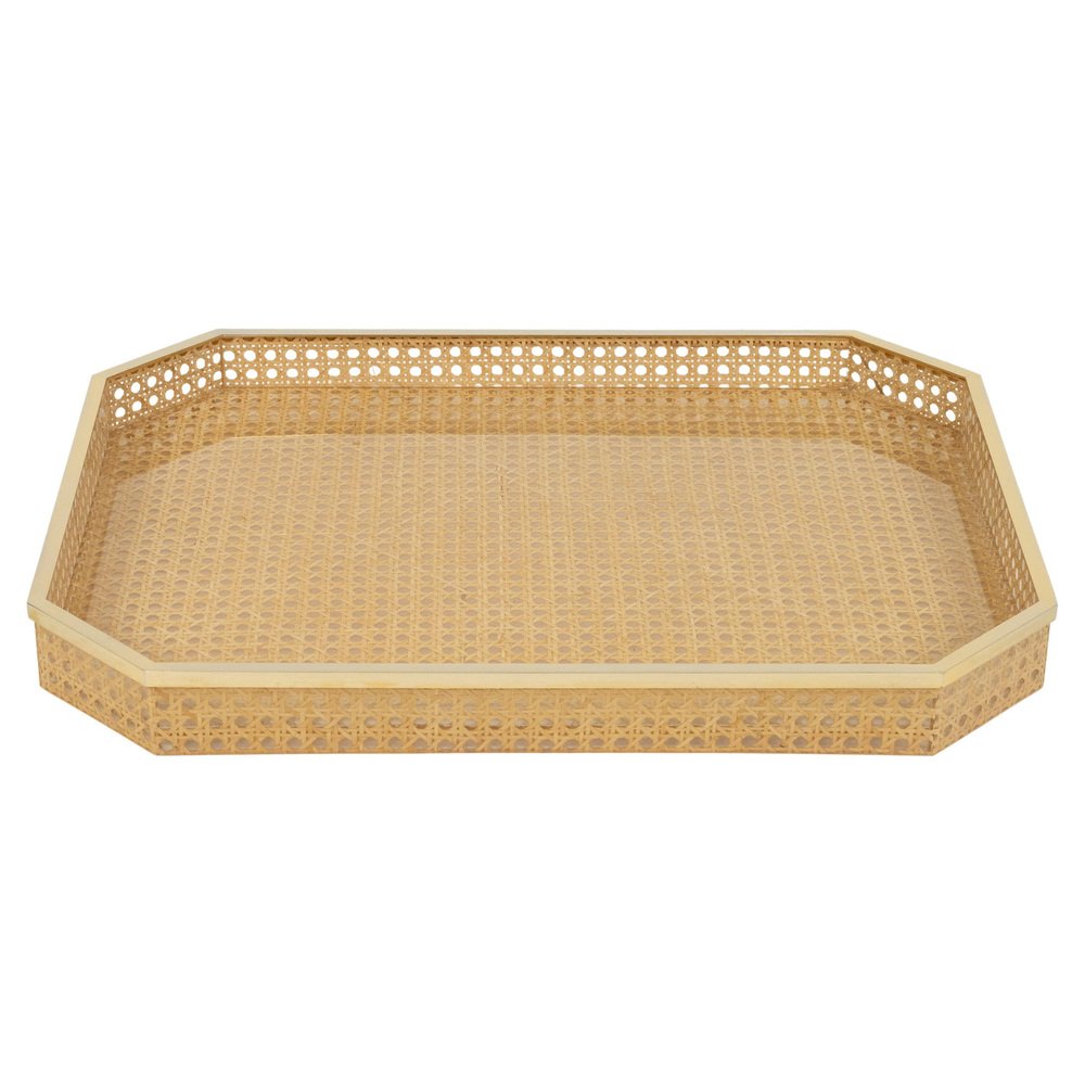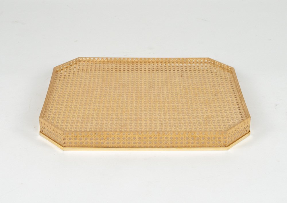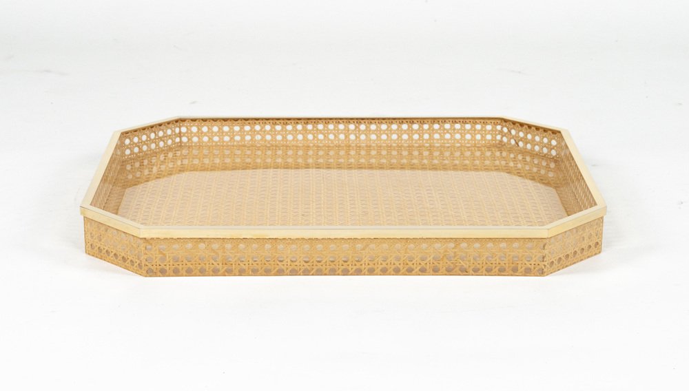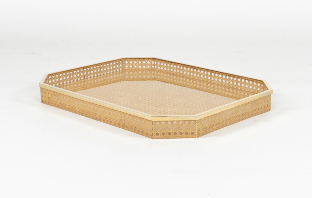 Vassoio Mid-Century moderno in vimini e ottone di Christian Dior, anni '70