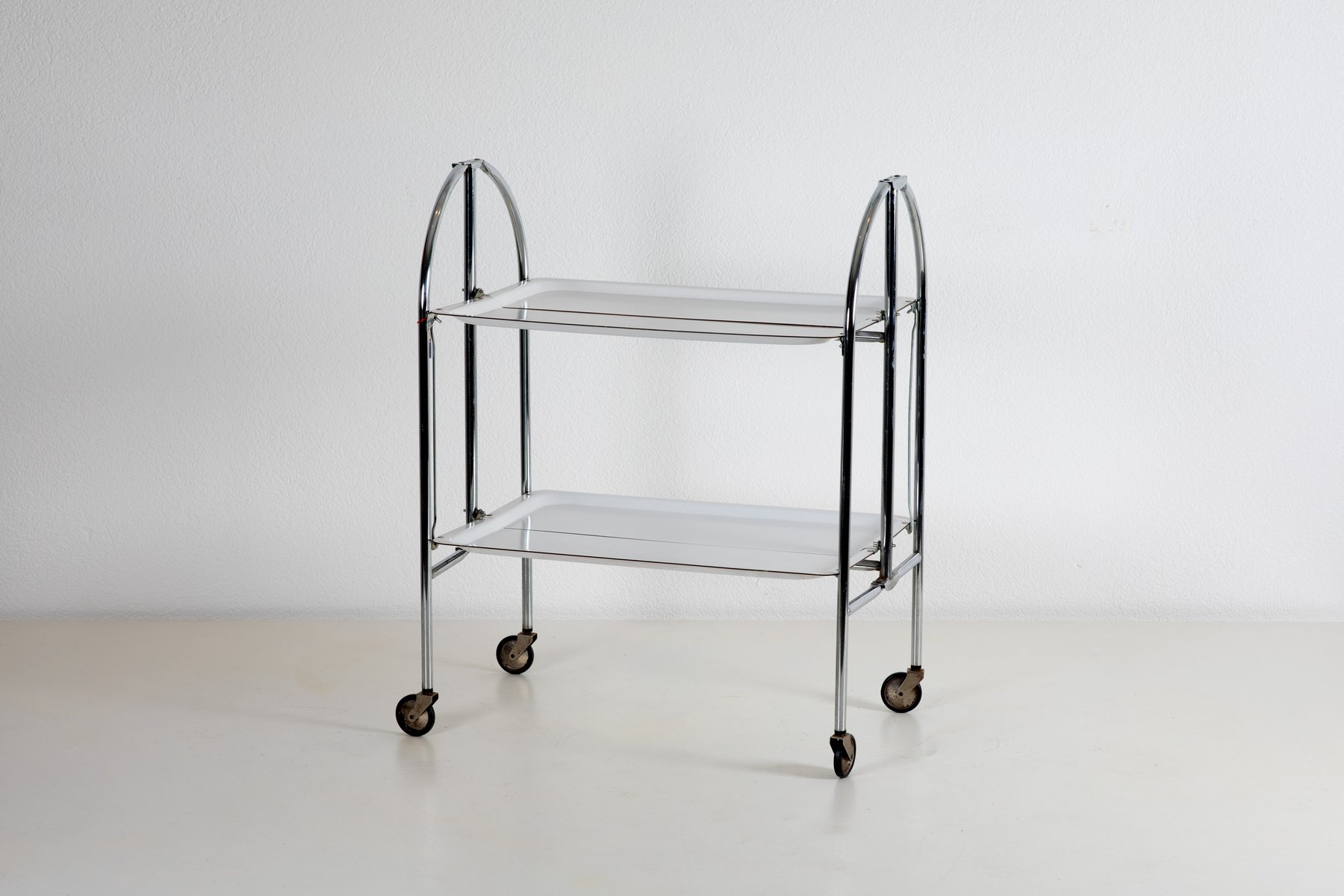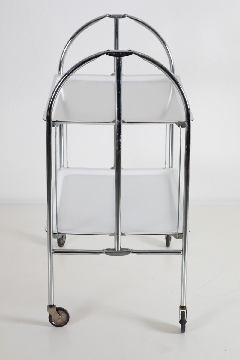 Questo funzionale ed elegante vassoio per traslochi, progettato e prodotto in Europa negli anni '70, presenta un'elegante struttura cromata con pratici vassoi in plastica. Con un'altezza di 70 cm, è un complemento versatile e moderno per qualsiasi casa o ufficio. L'aspetto unico di questo pezzo sta nella sua mobilità e nel suo design minimalista, pratico ed esteticamente gradevole, ideale per servire o organizzare gli oggetti.