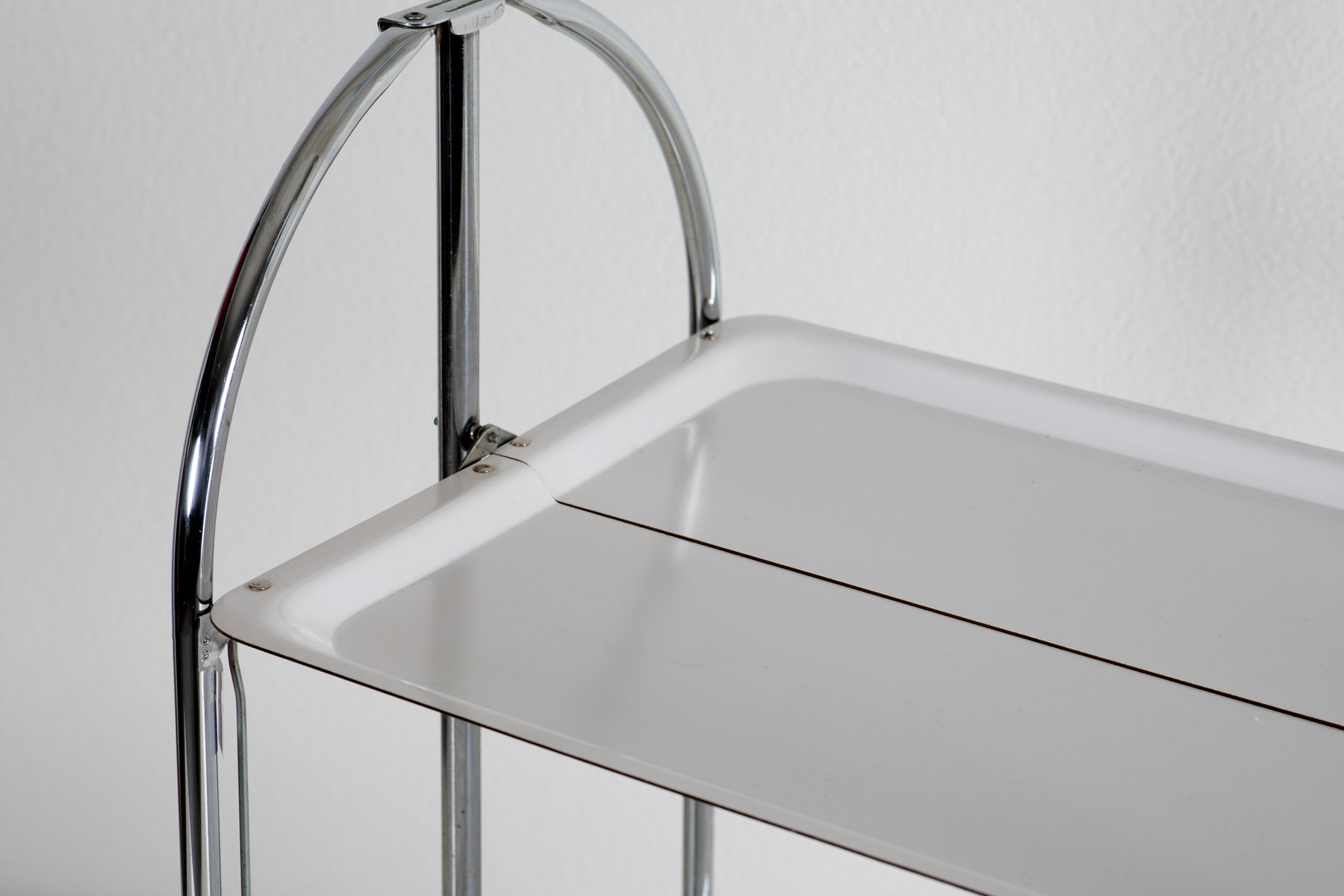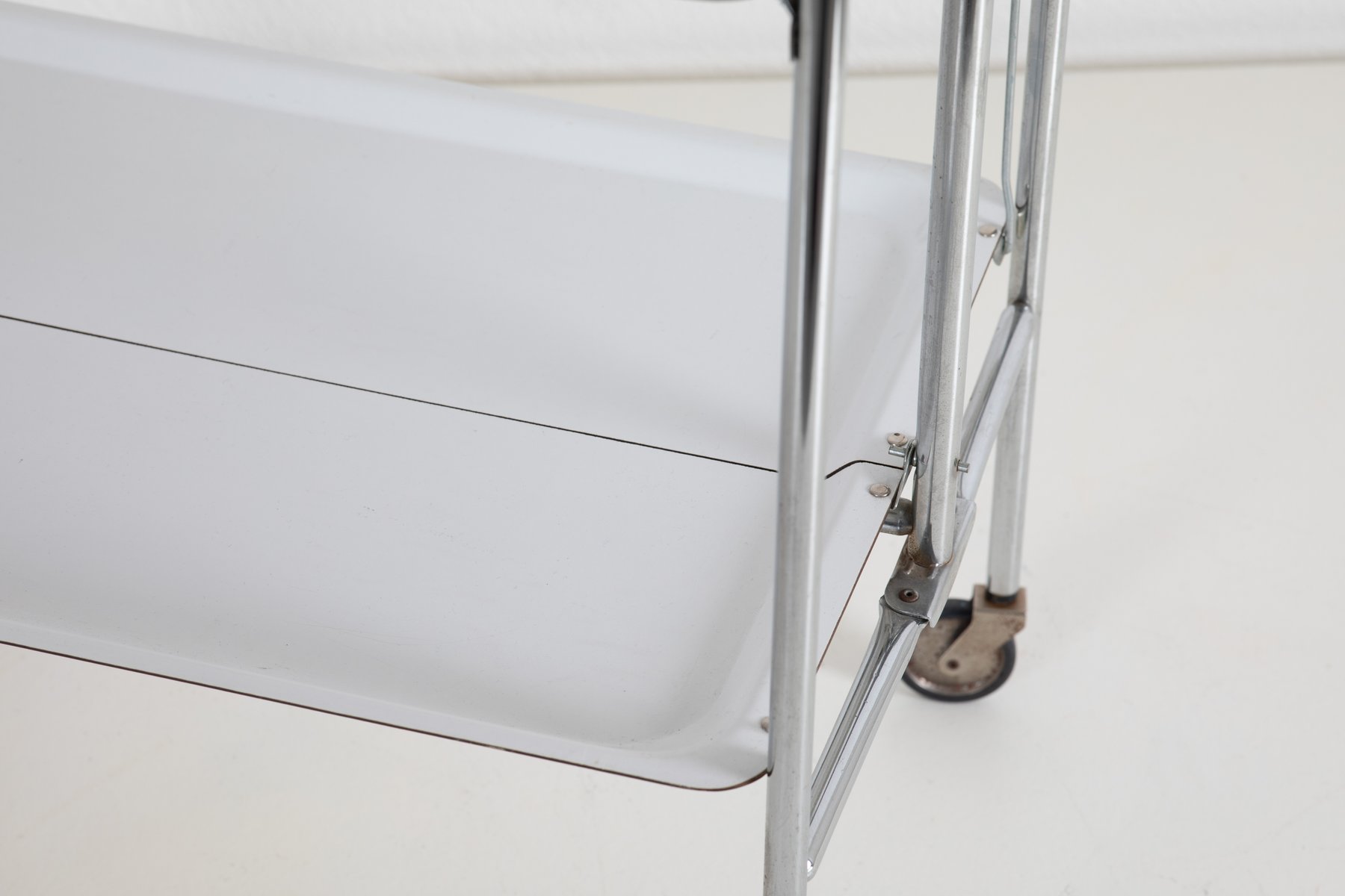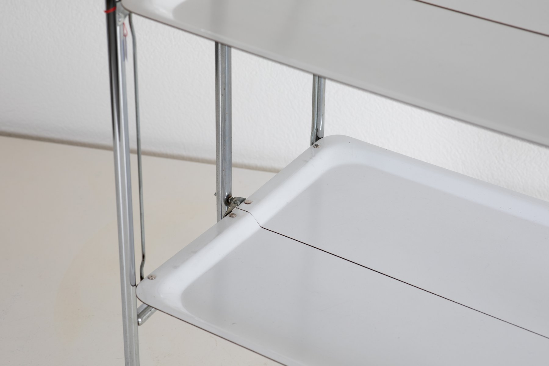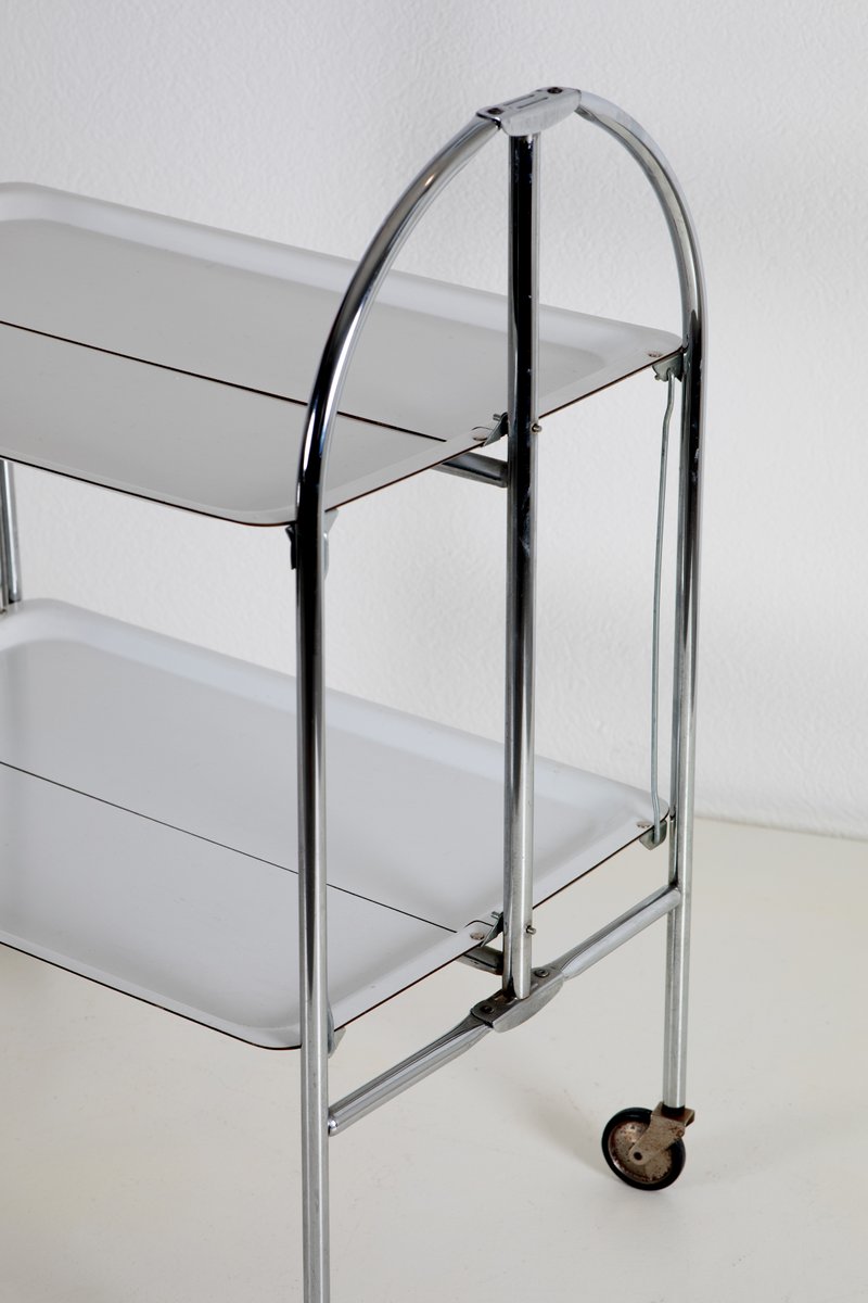 This functional and stylish Moving Tray, designed and manufactured in Europe in the 1970s, features a sleek chrome frame with practical plastic trays. Standing at 70 cm in height, it serves as a versatile and modern addition to any home or office. The unique aspect of this piece lies in its mobility and minimalist design, which is both practical and aesthetically pleasing, ideal for serving or organizing items.