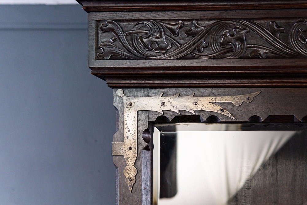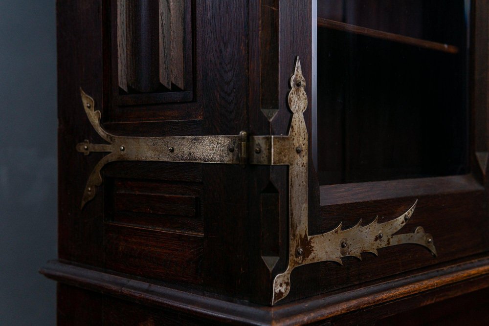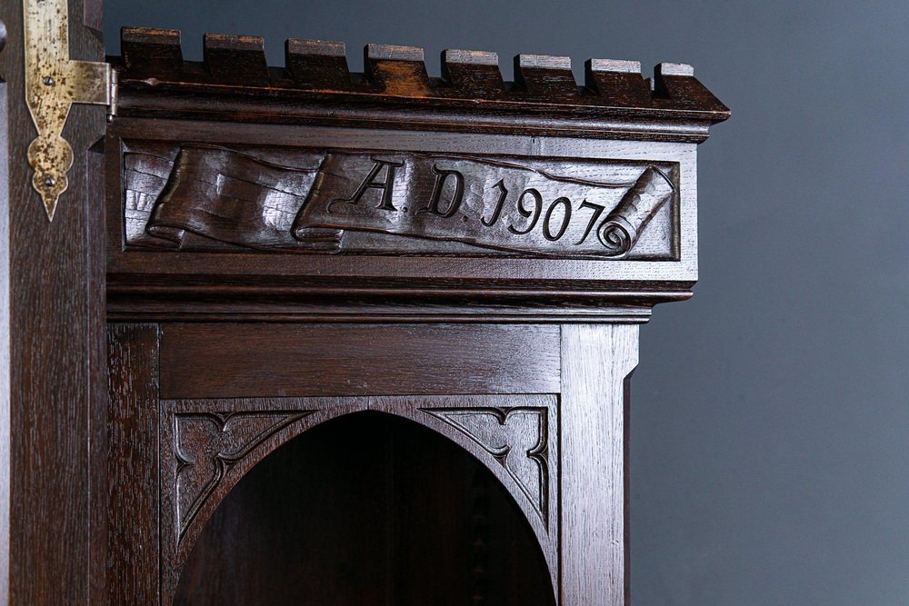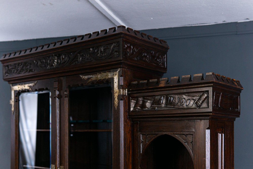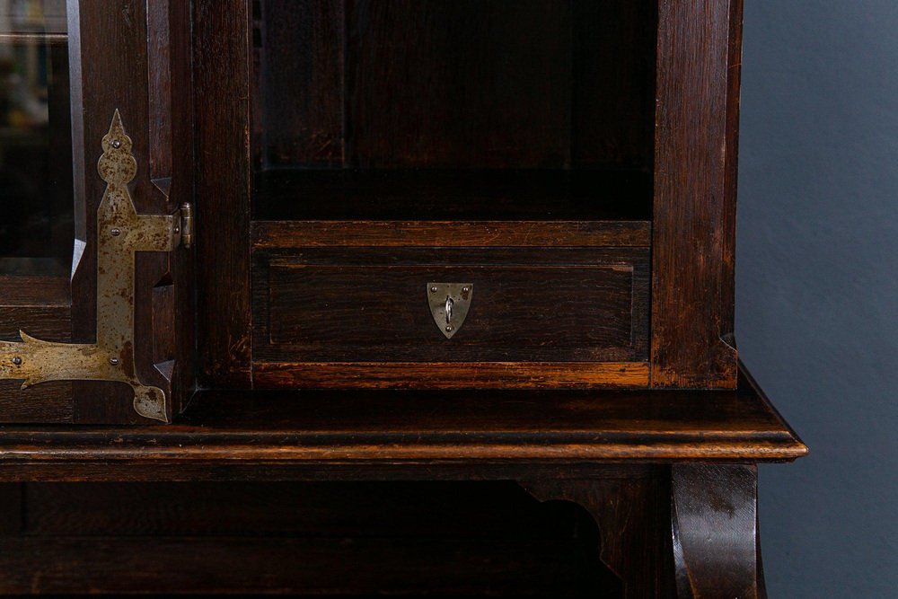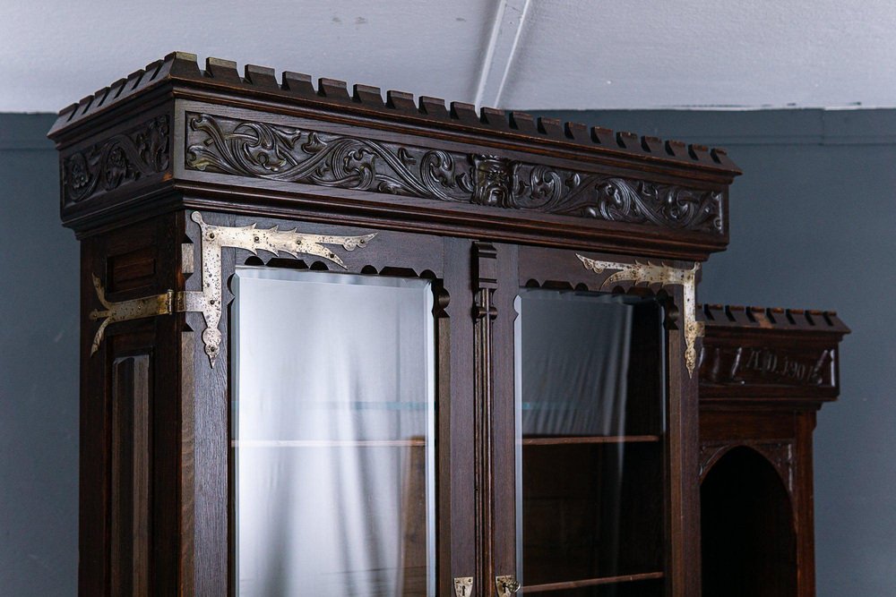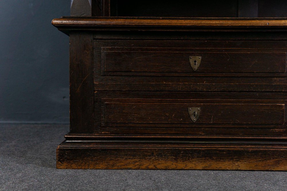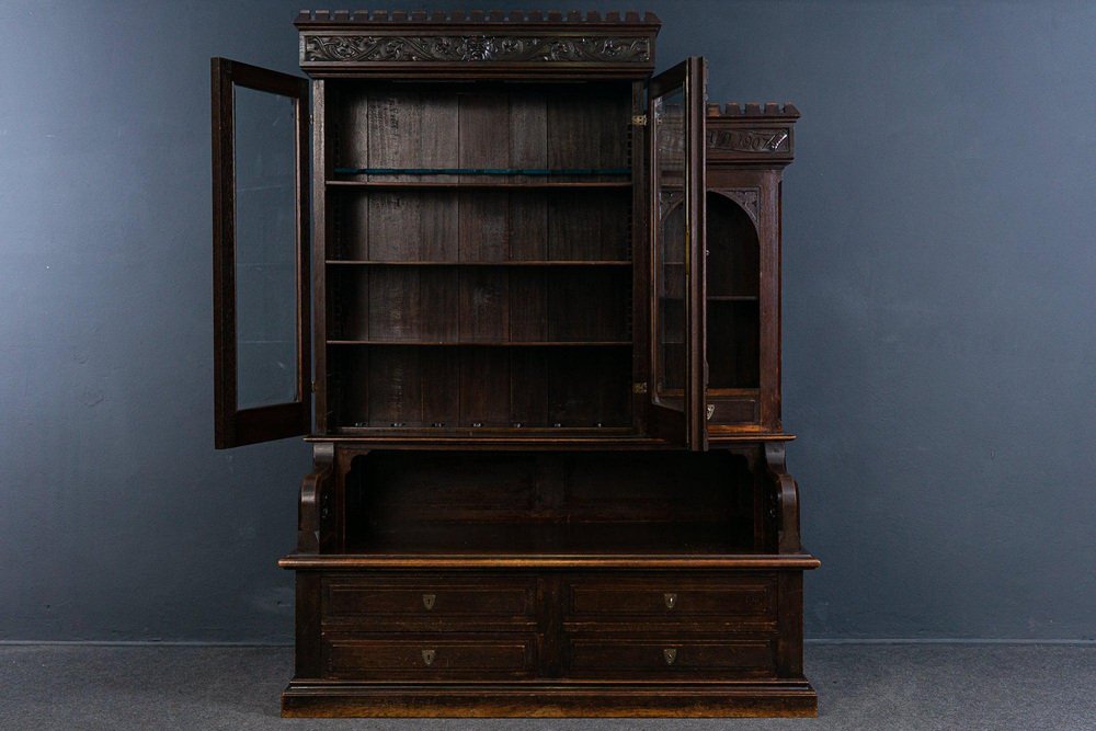 Display bench top/bookcase Epoch & style: Neo-Gothic (Art Nouveau) - beginning of the 20th century Features - veneered in oak, partly solid, dark stained - rich Gothic carving and differentiated Gothic decor, floral reliefs and crenellated wreath as a crown - flat carving, A.D. 1907" Anno Domini = probably year of manufacture - two-door upper part with faceted glass and compartment with pointed arch cutout - in the top four adjustable shelves via toothed strips and the former holder for hunting weapons - wide and deep seat with all-round profiled edge and carved armrests - four wide, smooth-running drawers with double ones Fronts in the lower body - high base with adjacent profile - wrought iron fittings and key plates - four in total Key available - can be dismantled into three parts for transport and the doors can be removed. The furniture is in good condition with age-related signs of wear and rubbing. The solid seat plate has a shrinkage crack on the right and left. Dimensions: width 170cm, depth 84cm, height 229cm