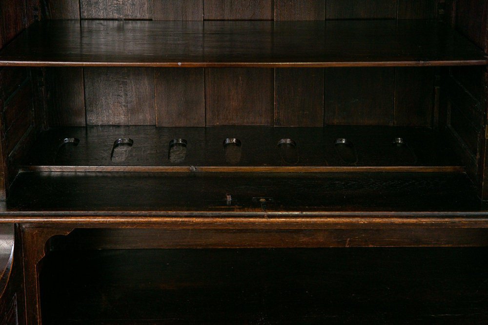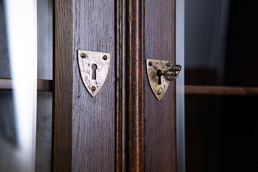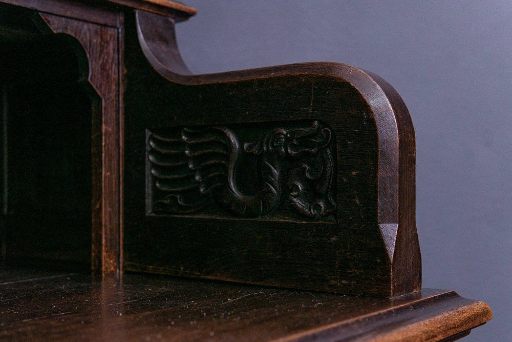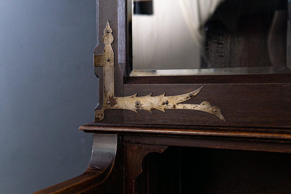 Banco espositivo/libreria Epoca e stile: Neogotico (Art Nouveau) - inizio XX secolo Caratteristiche - impiallacciato in rovere, in parte massiccio, tinto scuro - ricco intaglio gotico e decorazione gotica differenziata, rilievi floreali e corona merlata come corona - intaglio piatto, A.D. 1907" Anno Domini = probabilmente anno di fabbricazione - parte superiore a due ante con vetro sfaccettato e scomparto con ritaglio ad arco acuto - nella parte superiore quattro ripiani regolabili tramite strisce dentate e l'ex supporto per le armi da caccia - sedile ampio e profondo con bordo profilato a tutto tondo e braccioli intagliati - quattro cassetti larghi e scorrevoli con doppi frontali nella parte inferiore - base alta con profilo adiacente - ferramenta in ferro battuto e placchette per le chiavi - quattro in totale Chiave disponibile - può essere smontato in tre parti per il trasporto e le porte possono essere rimosse. Il mobile è in buone condizioni, con segni di usura e sfregamento dovuti all'età. La piastra del sedile massiccio presenta una crepa da ritiro a destra e a sinistra. Dimensioni: larghezza 170 cm, profondità 84 cm, altezza 229 cm