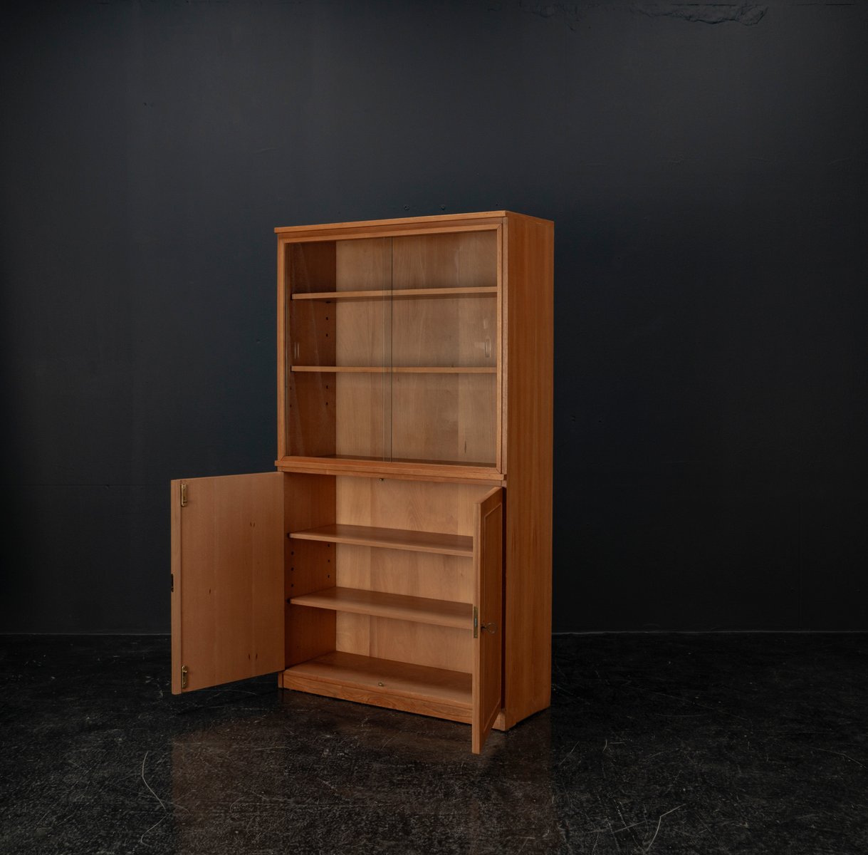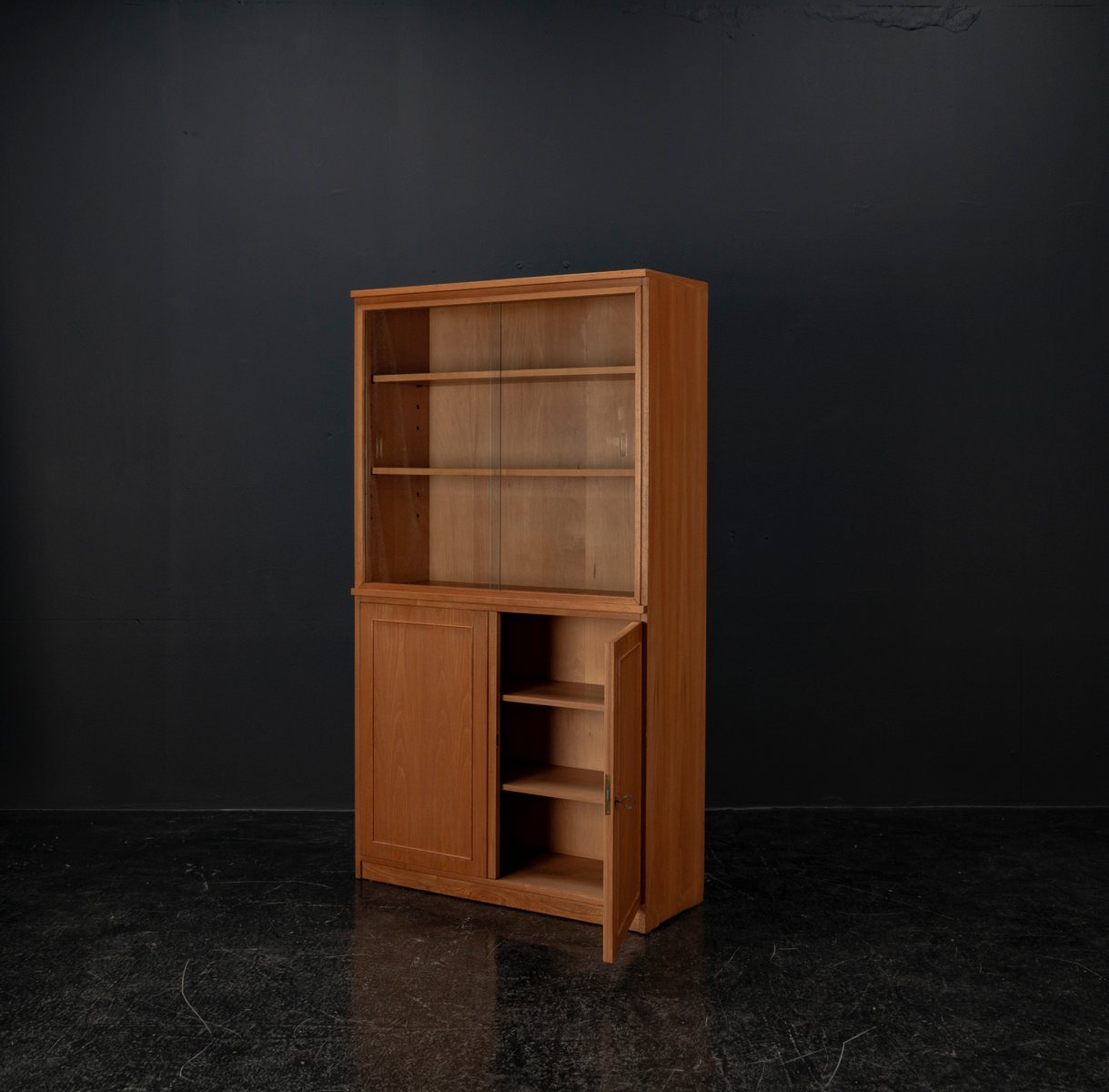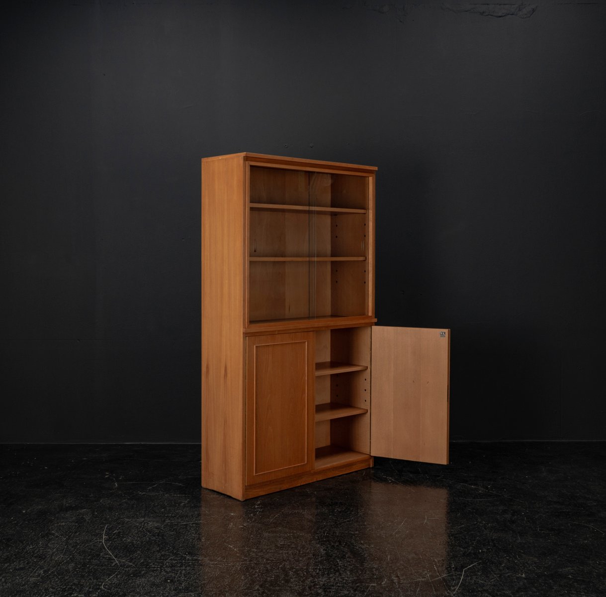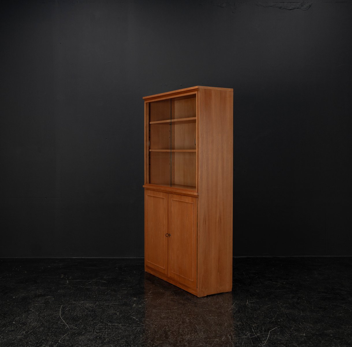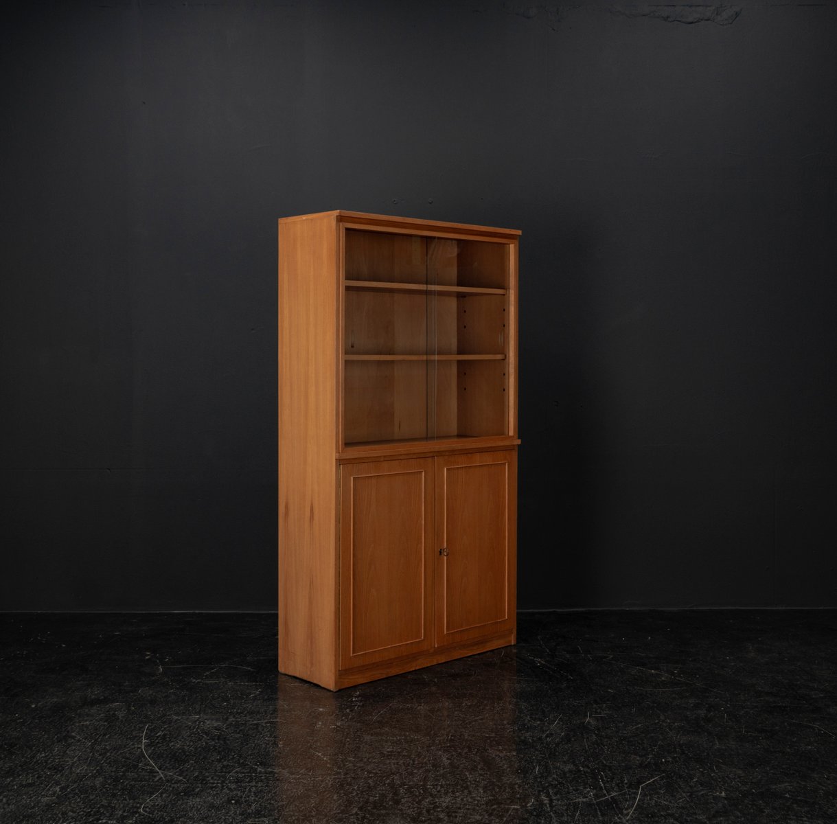 Display cabinet from the renowned manufacturer WK Möbel from the 1950s, made of light ash. This piece of furniture exudes modernity with a subtle echo of the waning Art Deco style of the 1950s. Clear lines, the accentuated horizontal and vertical structure, and the understated, elegant design reflect the transition from the ornamental era to the clear design language of post-war modernism. At the top are two sliding glass doors with two shelves, ideal for decorative objects or tableware. The lower section offers generous storage space behind two wooden doors with additional shelves; the interior of the cabinet is lined with beech. A distinctive, timeless piece of furniture that blends harmoniously into various interior styles.