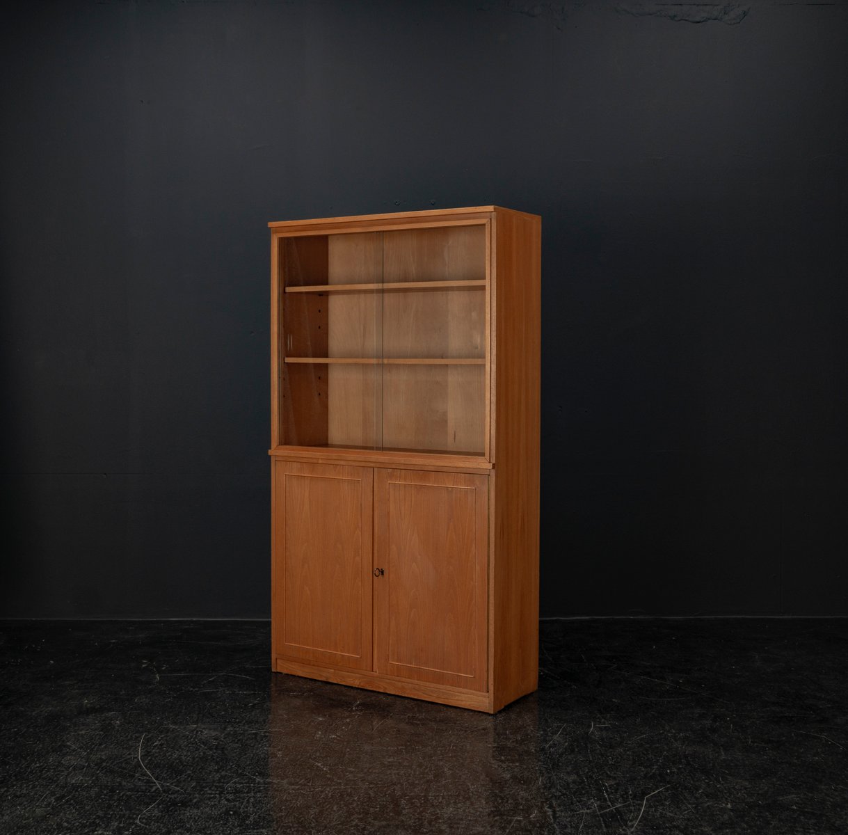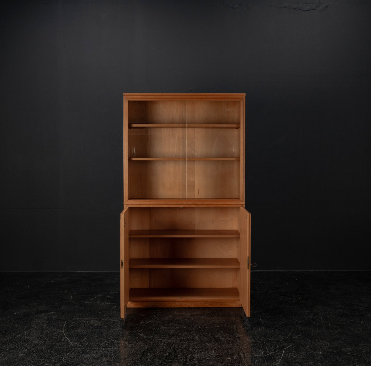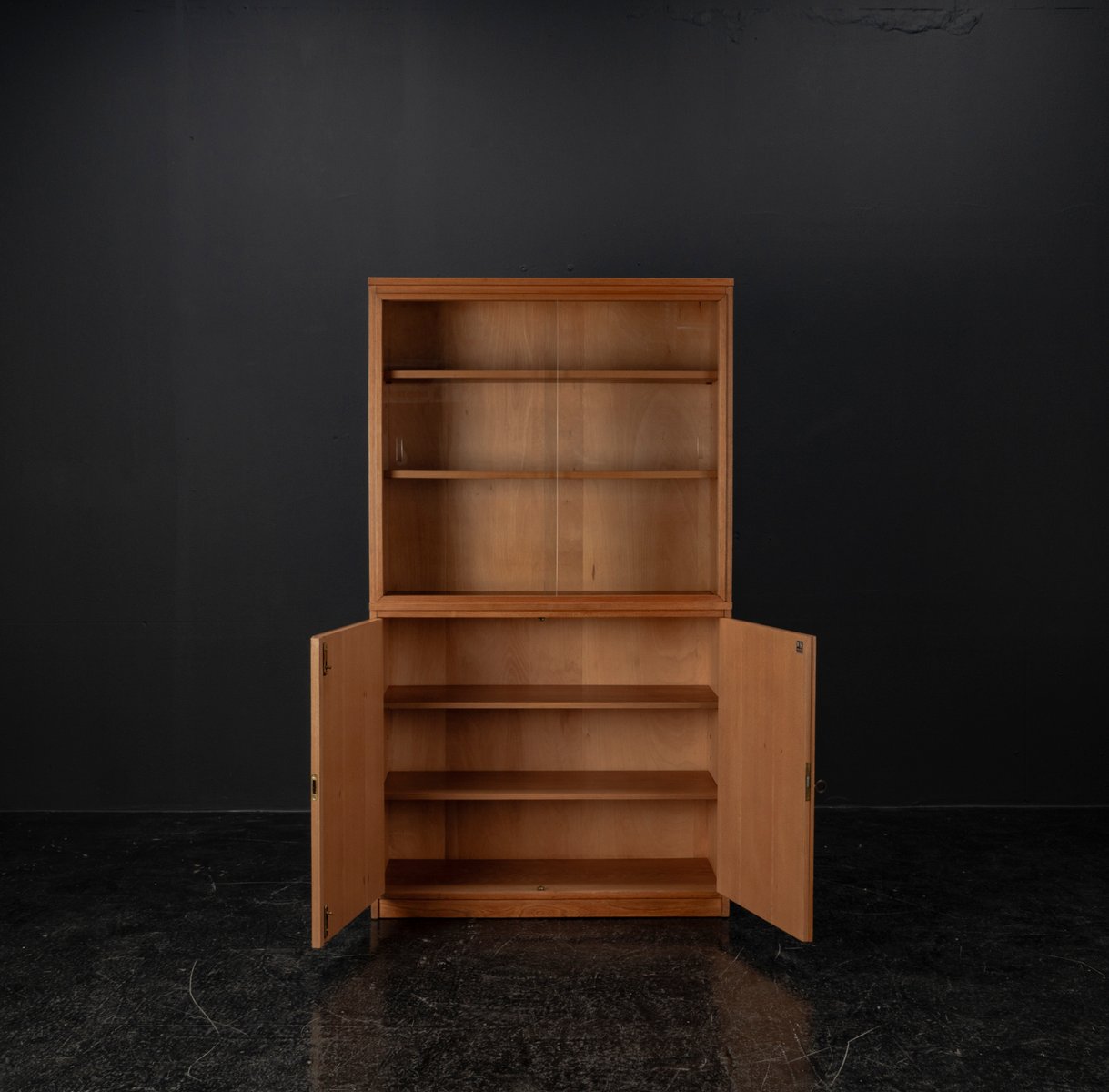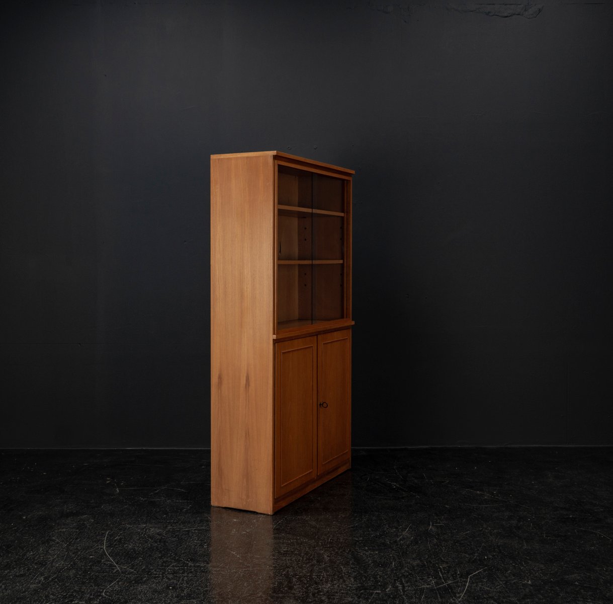 Display cabinet from the renowned manufacturer WK Möbel from the 1950s, made of light ash. This piece of furniture exudes modernity with a subtle echo of the waning Art Deco style of the 1950s. Clear lines, the accentuated horizontal and vertical structure, and the understated, elegant design reflect the transition from the ornamental era to the clear design language of post-war modernism. At the top are two sliding glass doors with two shelves, ideal for decorative objects or tableware. The lower section offers generous storage space behind two wooden doors with additional shelves; the interior of the cabinet is lined with beech. A distinctive, timeless piece of furniture that blends harmoniously into various interior styles.