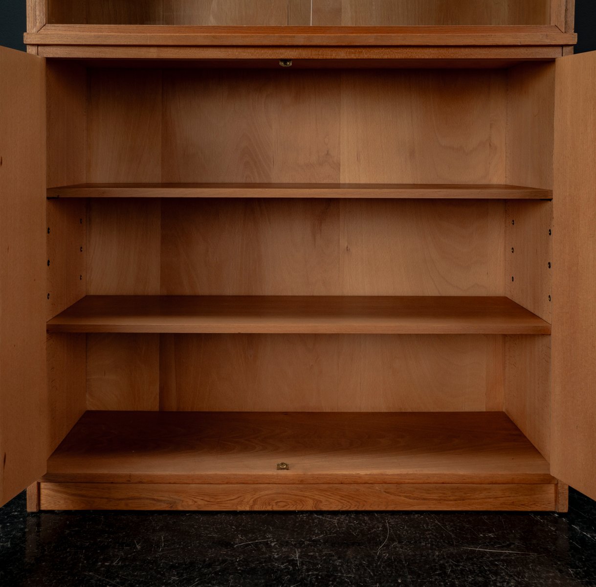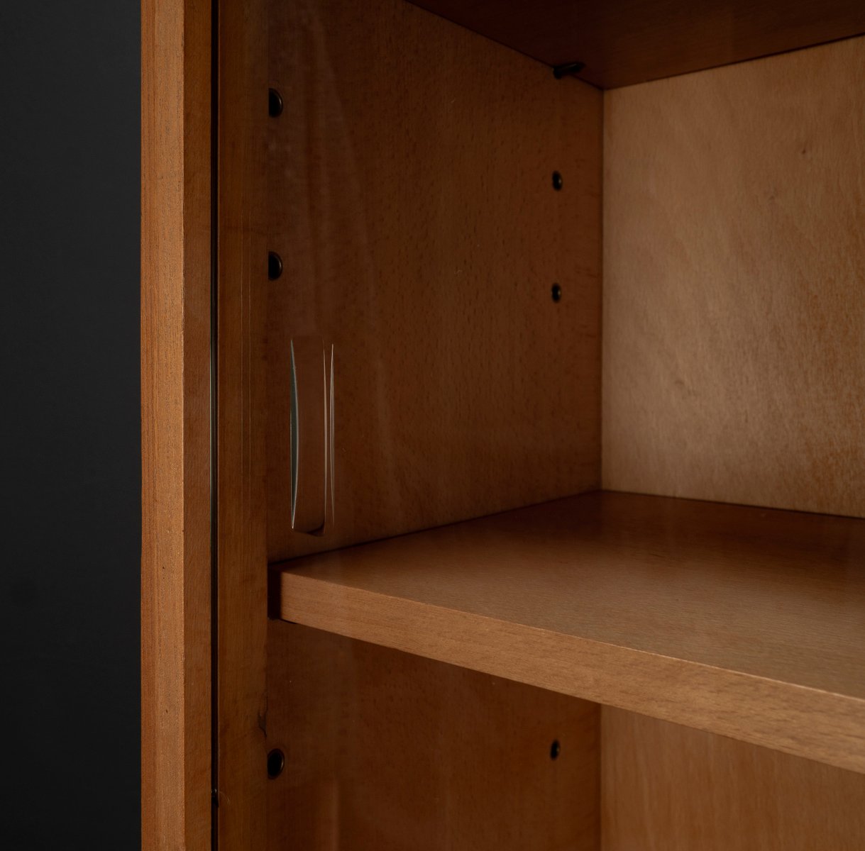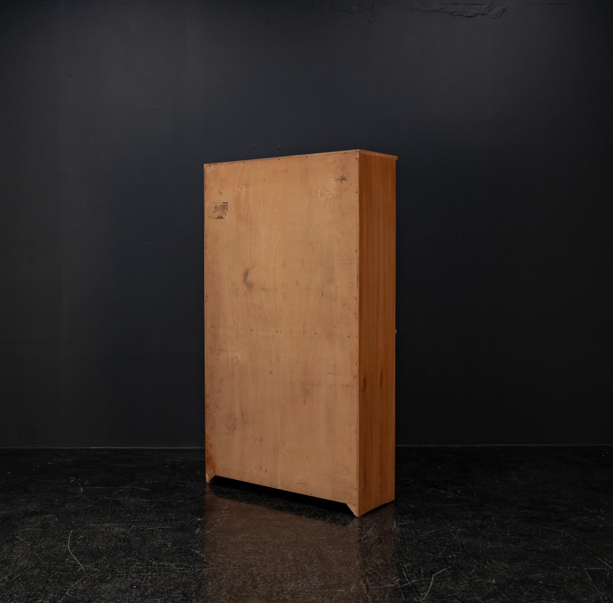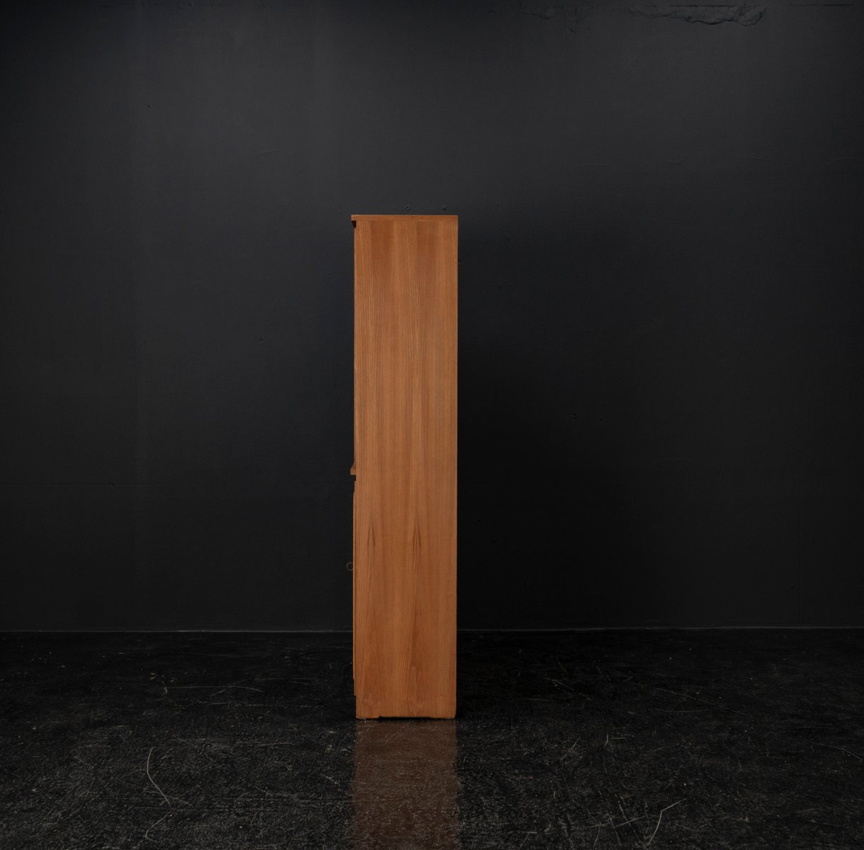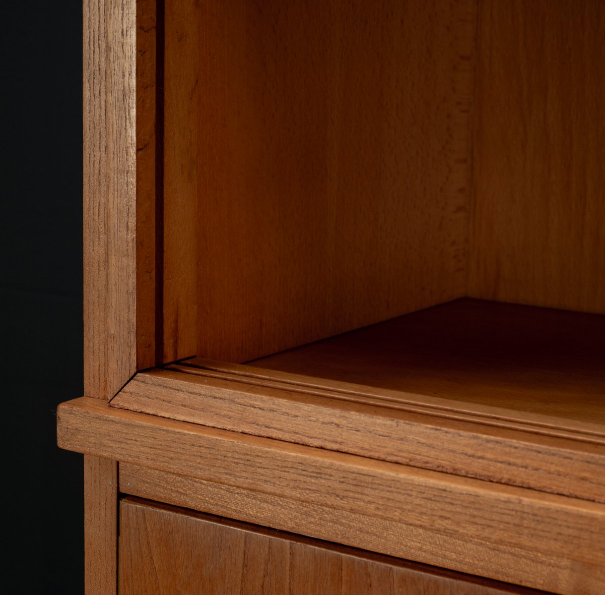 Display cabinet from the renowned manufacturer WK Möbel from the 1950s, made of light ash. This piece of furniture exudes modernity with a subtle echo of the waning Art Deco style of the 1950s. Clear lines, the accentuated horizontal and vertical structure, and the understated, elegant design reflect the transition from the ornamental era to the clear design language of post-war modernism. At the top are two sliding glass doors with two shelves, ideal for decorative objects or tableware. The lower section offers generous storage space behind two wooden doors with additional shelves; the interior of the cabinet is lined with beech. A distinctive, timeless piece of furniture that blends harmoniously into various interior styles.