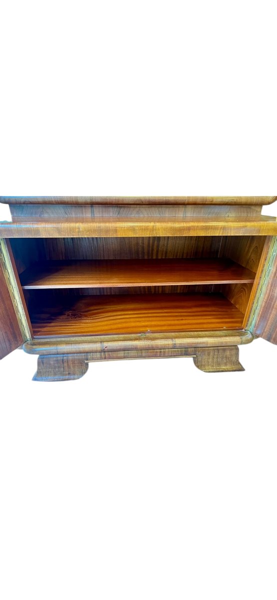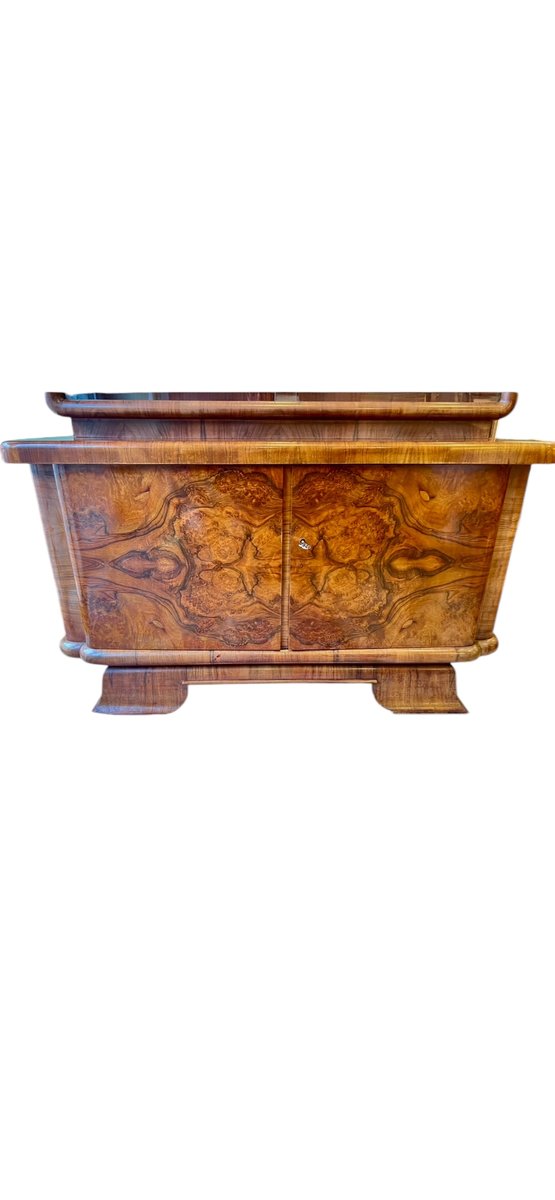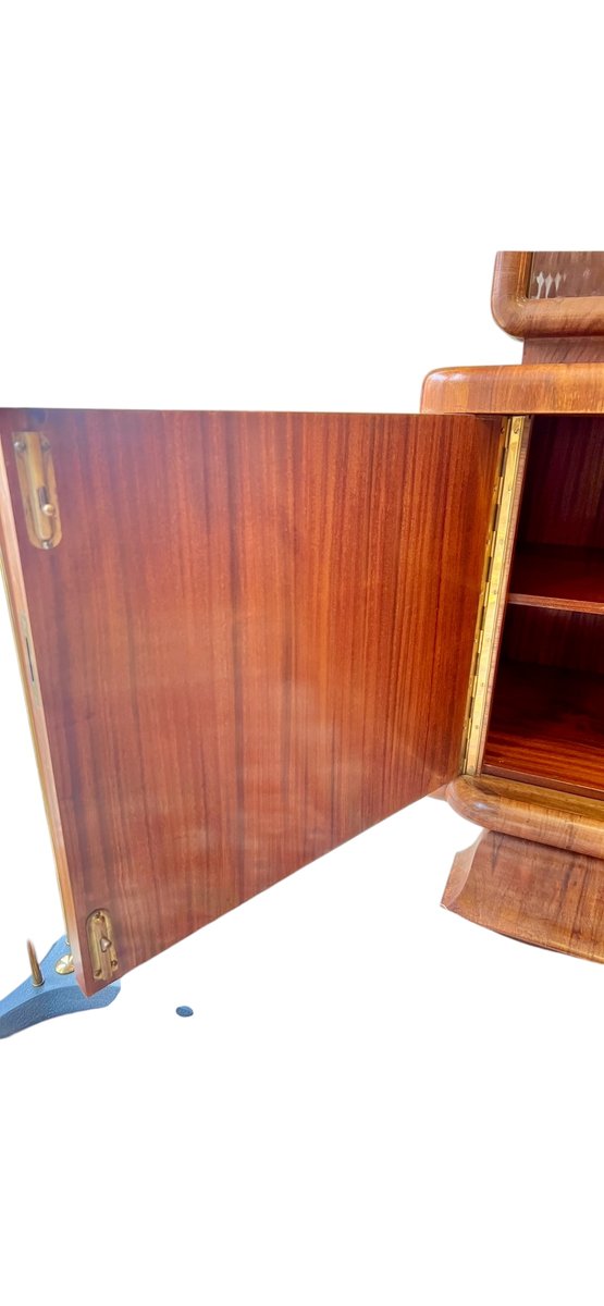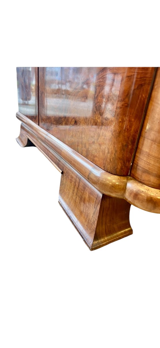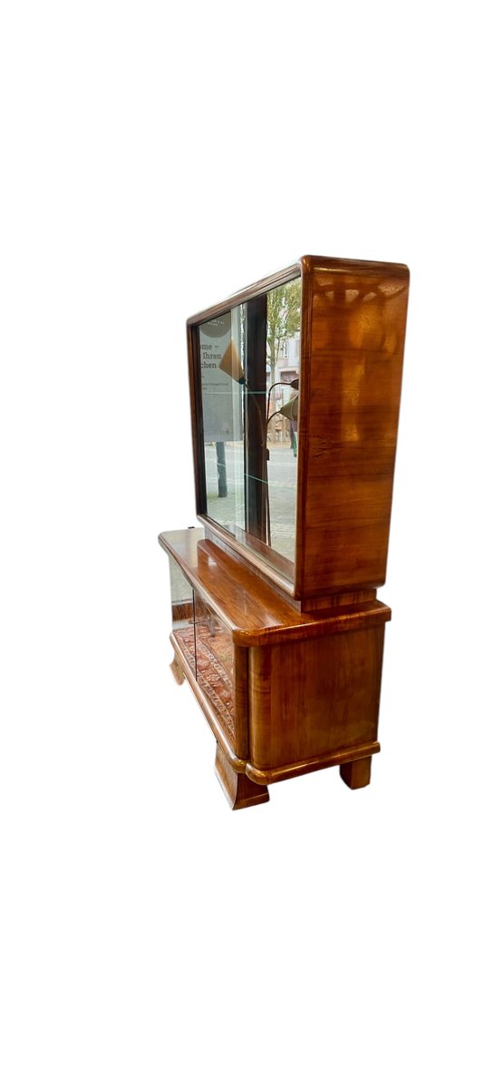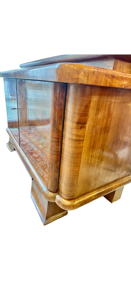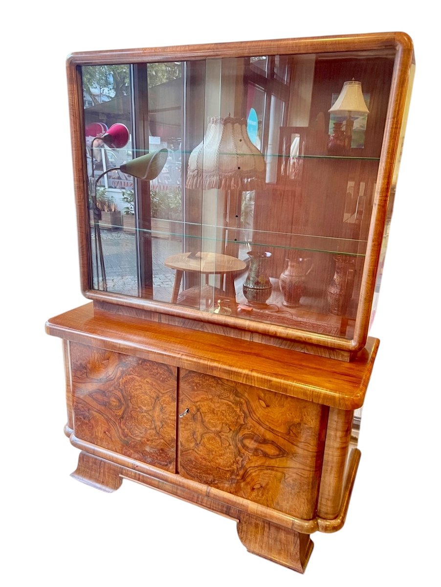 This Art Deco display cabinet was made in the 1930s in the style of the famous Czech designer Jindrich Halabala. The glass top is beautifully rounded and has two sliding glass doors and two glass shelves. The base cabinet stands on curved Art Deco legs and is veneered with walnut wood.