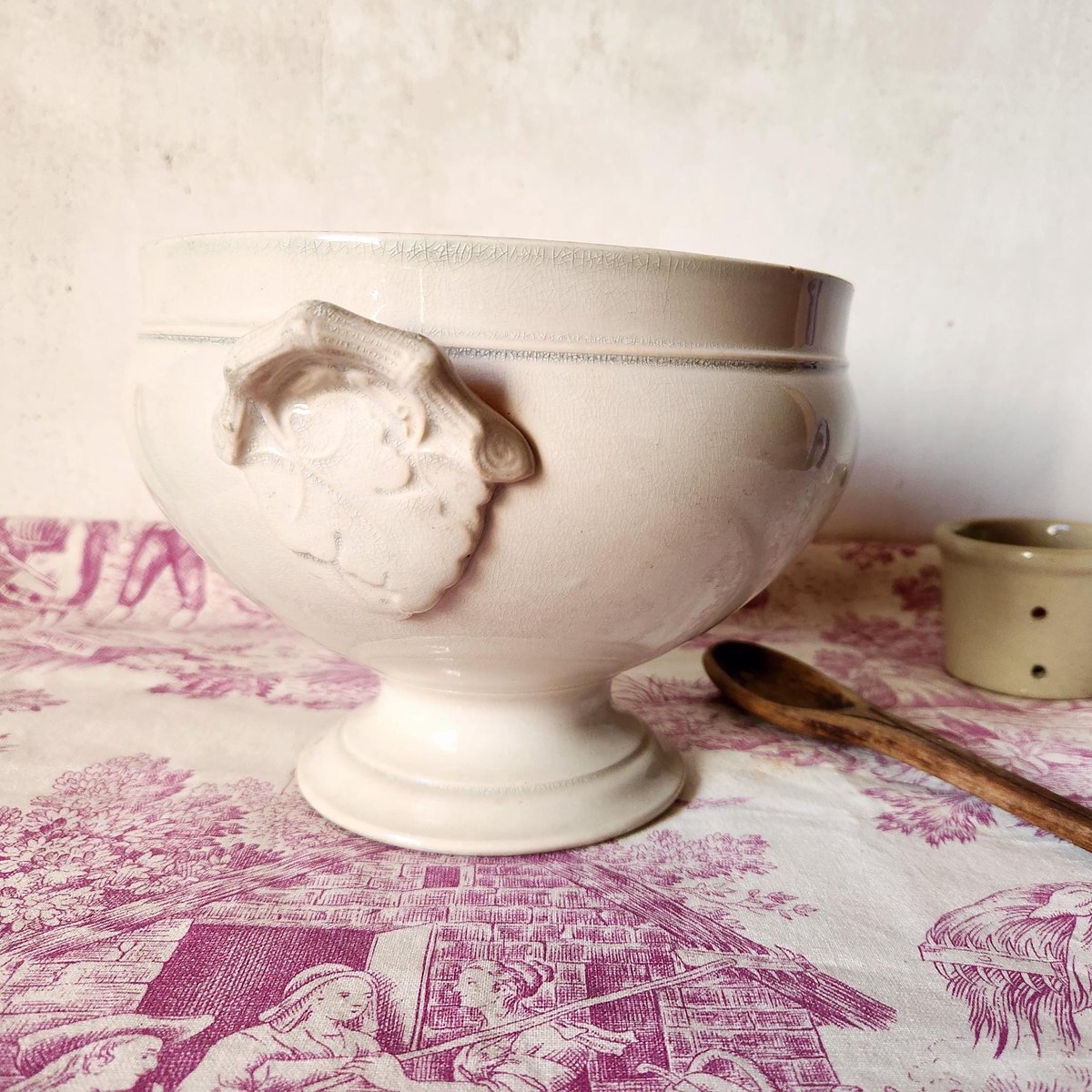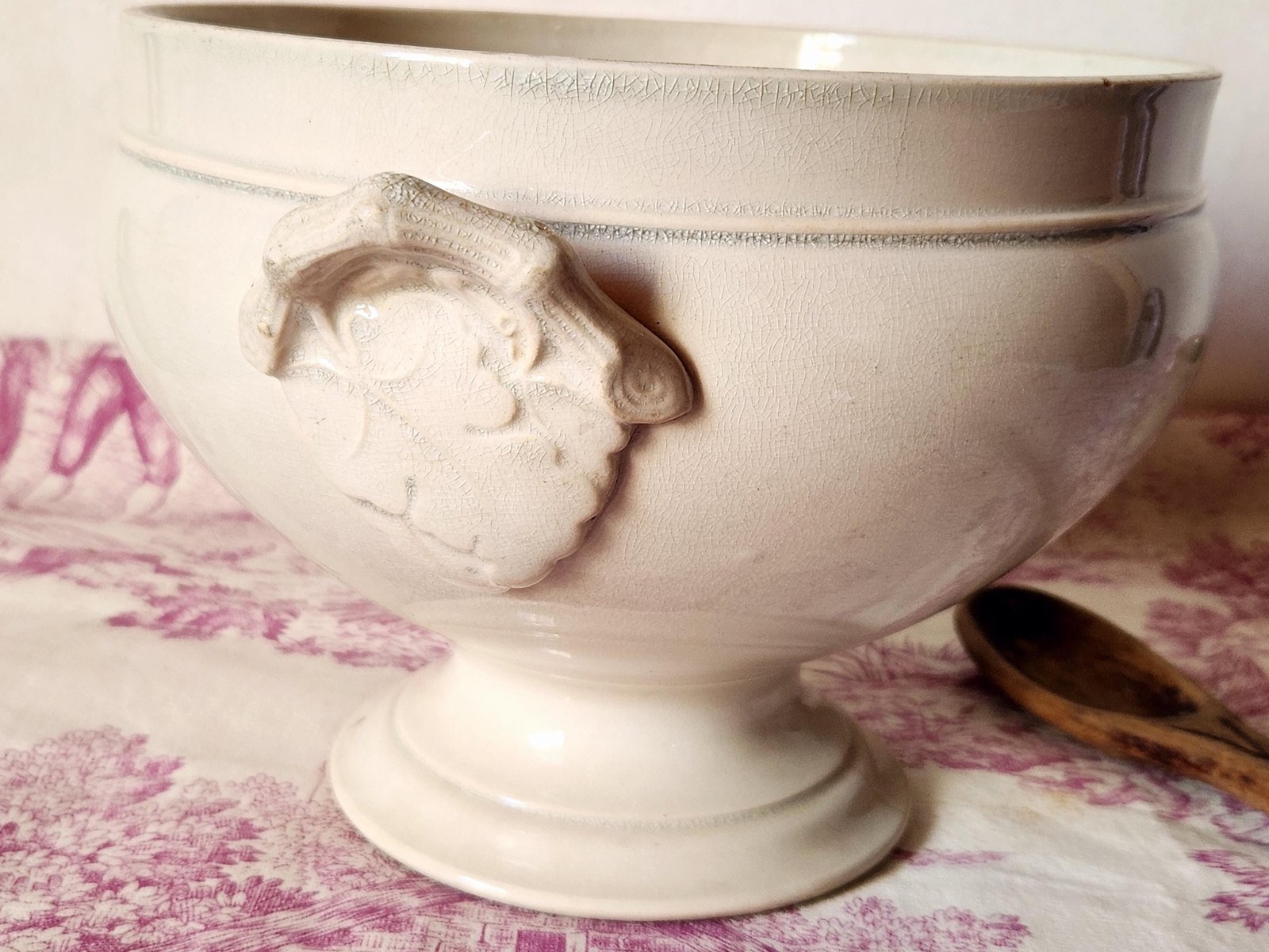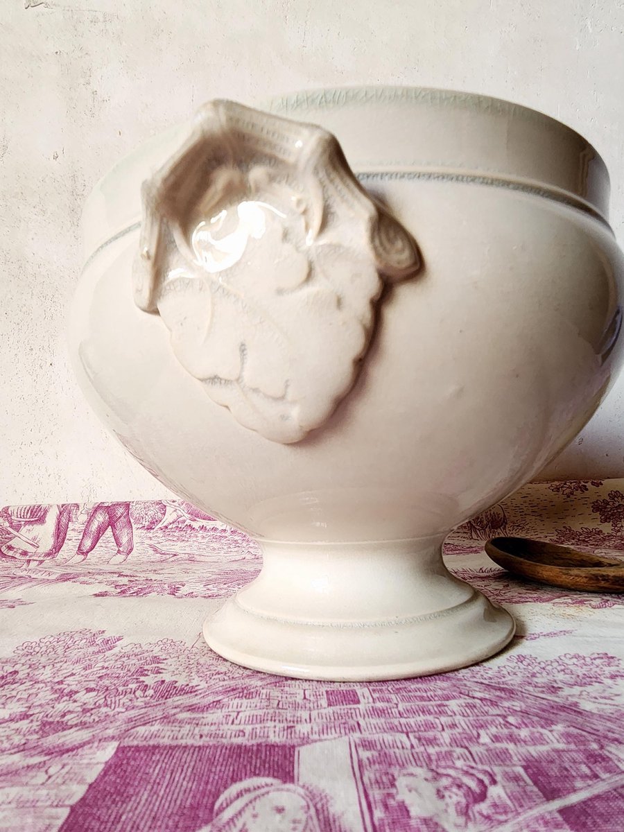 Zuppiera francese prodotta da Choisy Le Roi Hte Boulenger & Cie intorno al 1880. Si tratta di una zuppiera o di una grande ciotola con piede, senza coperchio, realizzata in pietra ferrosa/terre de fer. I manici sono decorati con foglie e rami.